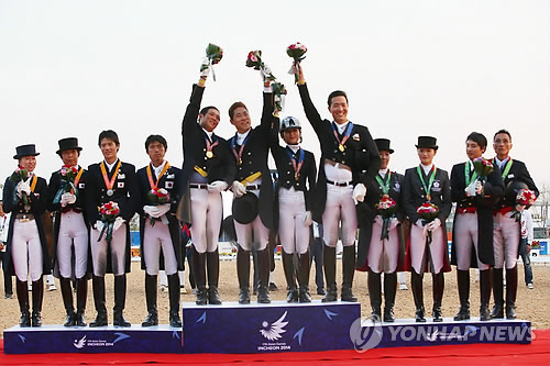 한국은 20일 오후 인천 드림파크 승마경기장에서 열린 2014 인천 아시안게임 승마 마장마술 단체전에 김균섭(33, 인천시체육회, 마명 다크시크릿), 김동선(25, 갤러리아승마단, 파이널리), 황영식(24, 세마대승마장, 퓌르스텐베르크), 정유연(18, 청담고, 로열레드2)이 출전해 상위 3명의 평균 점수에서 71.737%를 얻어 일본(69.842%)을 제치고 1위에 올랐다.