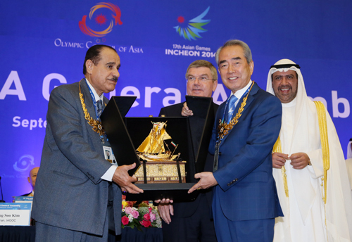 [천지일보=김현진 기자] 2014인천아시아경기대회 조직위원회 김영수 위원장이 20일 인천 송도컨벤시아 프리미어볼룸에서 열린 제33차 OCA 총회에서 지난 2013년 제4회 인천실내무도대회의 성공적 개최와 제17회 인천아시아경기대회 개최 준비 및 국제스포츠계 발전에 기여한 바를 인정받아 금장을 수상했다.
