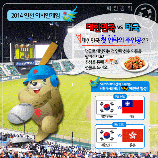 또 태국과의 아시안게임 야구 예선전에 맞춰 대한민국 대표팀의 첫 안타의 주인공을 맞춘 누리꾼 17명에게 국민응원 간식인 치킨 세트를 전달하고, SK텔레콤이 후원하는 수영 꿈나무 프로젝트 1호 이다린 선수 응원하기 이벤트를 진행해 아시안게임 대표 선수단에 대한 관심과 응원을 이끌어 낸다는 목표다.