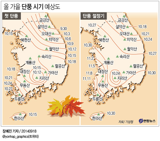 올해 첫 단풍은 오는 28일 설악산에서 제일 먼저 볼 수 있겠다. 중부지방과 지리산에서는 10월 3~18일 사이, 남부지방에서는 10월 14~27일 사이에 첫 단풍을 볼 수 있을 것으로 예상된다.