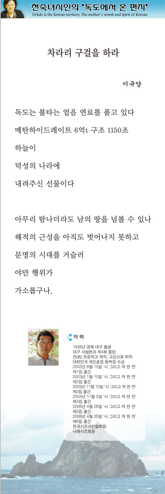 관련기사 [독도시] 화난 마음~ 갈앉히는 독도 - 천숙녀 [독도시] 독도가 하는 말 - 신국현 [독도시] 독도는 피 흘리네 - 서재균 [독도시] 동해의 독도 - 이혜우 [독도시] 새말 휴게소에 독도가 있었다 - 장분선 [독도시] 독도는 역사다 - 김종길 [독도시] 독도는 본토 지킴이 - 김일영 [독도시] 독도 - 무애자 청학 [독도시] 독도 슈퍼마켓 - 이숙영 [독도시] 부끄럽지 않느냐 - 전서영
