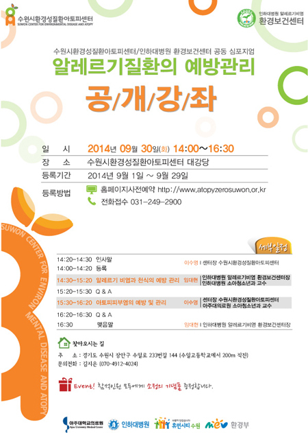 강사는 임대현 인하대병원 소아청소년과 교수와 이수영 아주대병원 소아청소년과 교수가 각각 ‘알레르기 비염과 천식의 예방관리’와 ‘아토피 피부염의 예방 및 관리’라는 주제로 시민들에게 유익한 정보를 제공할 예정이다.