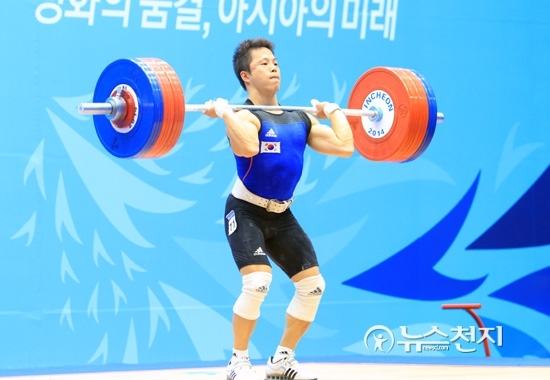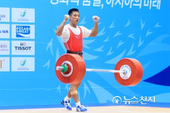 [천지일보=김현진 기자] 22일 인천 송도 달빛축제정원역도경기장에서 열린 2014 인천아시안게임 남자역도 69㎏급에서 원정식(24, 고양시청)이 용상 2차시기 도중 부상을 당해 기권한 가운데 북한의 김명혁(24)이 은메달을 목에 걸었다.