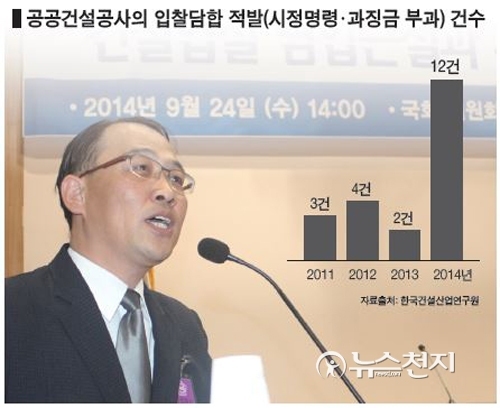 24일 한국건설산업연구원 김영덕 연구위원이 발표한 ‘공공공사 입찰 담합 실태’에 따르면 공공건설공사의 입찰담합 적발(시정명령·과징금 부과) 건수는 올해 한해에만 12건이다. 지난 2011년 3건, 2012년 4건, 2013년 2건 등으로 대폭 증가한 수치다.