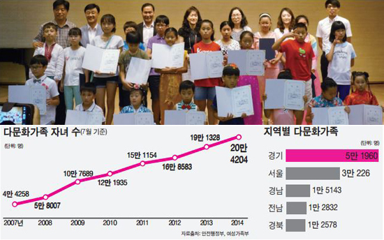 28일 안전행정부와 여성가족부에 따르면 2007년 4만 4258명이던 다문화가족 자녀는 2009년 10만 명을 넘어선 뒤 2010년 12만 1935명, 2011년 15만 1154명, 2012년 16만 8583명, 지난해 19만 1328명, 올해 20만 4204명으로 증가 추세를 보이고 있다. 예전에 비해 증가 폭이 크진 않지만 계속 늘고 있는 셈이다.