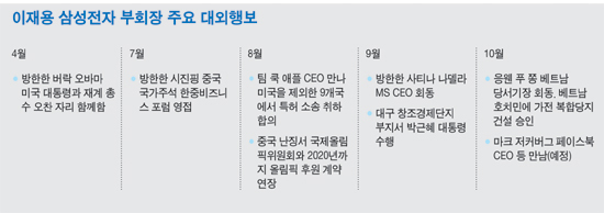 또한 이 부회장은 글로벌 IT 업계 CEO들과도 잇따라 회동하고 ‘글로벌 경영인’으로서의 입지를 강화하고 있다. 지난 8월에는 팀 쿡 애플 CEO를 미국에서 만나 장기간 끌어 온 특허 소송 문제에서 극적인 타결에 합의했다.
