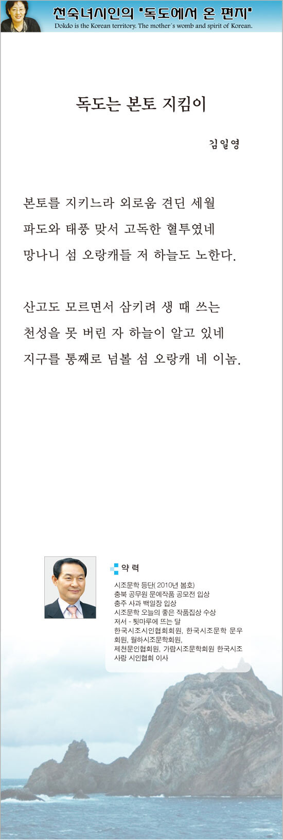 관련기사 [독도시] 독도는 역사다 - 김종길 [독도시] 차라리 구걸을 하라 - 이규양 [독도시] 화난 마음~ 갈앉히는 독도 - 천숙녀 [독도시] 독도가 하는 말 - 신국현 [독도시] 독도는 피 흘리네 - 서재균 [독도시] 독도 - 무애자 청학 [독도시] 독도 슈퍼마켓 - 이숙영 [독도시] 부끄럽지 않느냐 - 전서영 [독도시] 파란빛 독도 - 강민경 [독도시] 섬장대 - 고봉선 [독도시] 독도 처음 마주 하던 날 - 정영화