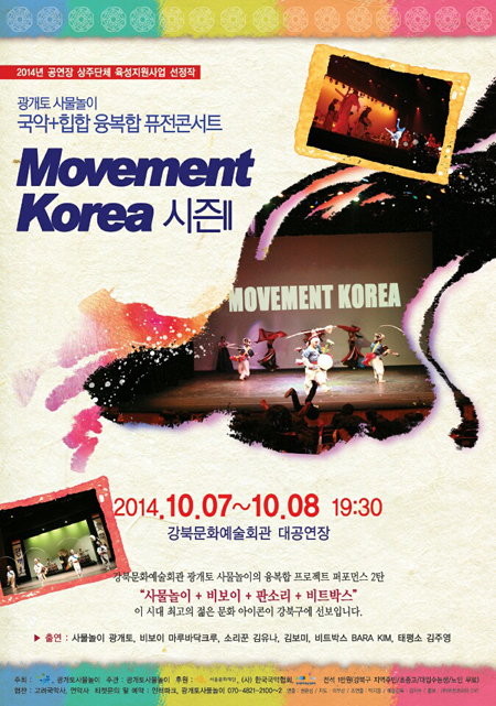광개토 사물놀이 예술단을 중심으로 비보이 마룻바닥크루, 판비트 소리(소리꾼 김유나, 비트박스 바라KIM) 등 한국을 대표하는 젊은 문화 아이콘들이 대거 출연해 서로의 예술적 기예를 창조적 작업으로 완성한 퓨전 콘서트 무브먼트 코리아로 탄생했다.