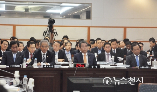국정감사 첫날인 7일 서울 종로구 정부서울청사에서 안전행정부 국정감사가 진행되고 있는 가운데 정종섭 안행부 장관을 비롯한 관계자들이 증인석에 앉아 있다.