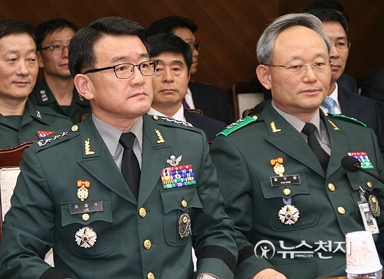 [천지일보=임문식 기자] 19대 국회 후반기 국정감사 시작 이틀째인 8일 오전 서울 용산구 국방부 청사에서 국방부에 대한 국정감사가 열린 가운데 이재수 국군기무사령관(왼쪽)이 증인석에 앉아 있다. 오른쪽은 황우웅 국군 복지단장.