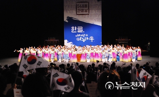 [천지일보=박선혜 기자] 568돌 한글날을 맞아 9일 세종문화회관 대극장에서 ‘한글 세상의 아름다움’이란 주제로 경축식이 진행된 가운데, 참석자들이 태극기를 흔들며 한글날 노래를 부르고 있다.
