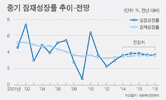 잠재성장률은 2001~2002년 연평균 5.2%였으나 2003~2005년 내수 부진에 따라 4.8%로, 2006~2007년 4.2%로 각각 추락한 데 이어 경제위기가 닥친 2008년부터 2013년까지 3.5%로 내려앉은 것으로 예정처는 추정했다.