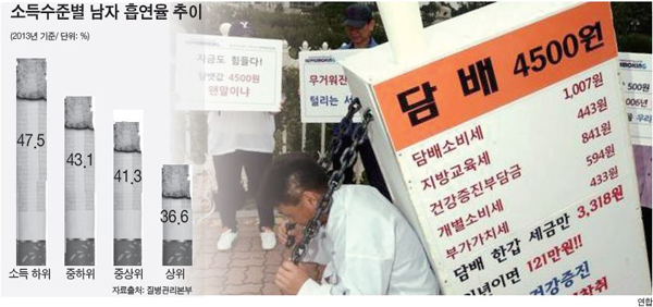 2013년 기준으로 소득 하위 흡연자는 47.5%로, 소득 하위 남자 2명 중 1명은 흡연하고 있는 것으로 나타났다. 중하위 흡연자는 43.1%, 중상위는 41.3%, 상위는 36.6%다.