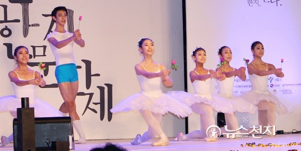 [천지일보=손예은 기자] 9일 오후 시청 앞 서울광장에서 ‘서울한지문화제’가 열린 가운데 개막식 오프닝 공연을 맡은 이원국 발레단이 꽃을 들고 무용을 선보이고 있다.