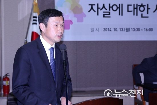 [천지일보=김민아기자] 하상훈 한국생명의전화 원장이 13일 서울 중구 프레스센터에서 열린 ‘자살에 대한 사회적 책임과 해결방안 토론회’에서 발제하고 있다.