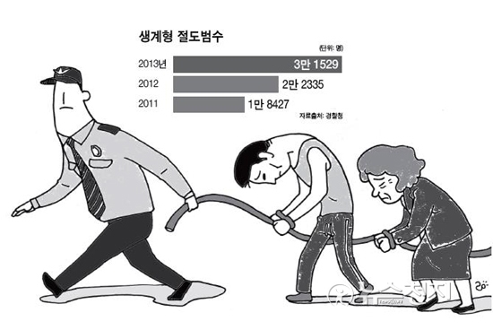 생계형 절도범수(비율)는 2011년 1만 8427명(16.3%), 2012년 2만 2335명(21.0%) 등 빠르게 증가했다. 유흥비를 마련하기 위해 범죄를 저지르는 비율(지난해 기준)은 강도 10.4%, 절도 7.0%로 조사됐다.