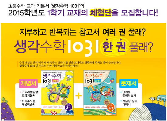 [천지일보=김민아 기자] 시매쓰출판(대표 이충기)이 ‘생각수학1031’의 2015학년도 1학기 교재 체험단 총 1200명을 모집한다고 13일 밝혔다.