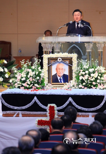 [천지일보=박준성 기자] 14일 오전 9시 서울 종로 한국교회100주년기념관에서 故 방지일 목사 한국기독교회장 장례예식’이 엄수됐다. 고인은 장례예식 후 장지인 강원도 춘천의 가족묘지에 안장된다. 故 방지일 목사 장례예식에서 설교하는 예장통합 증경총회장 림인식 목사.