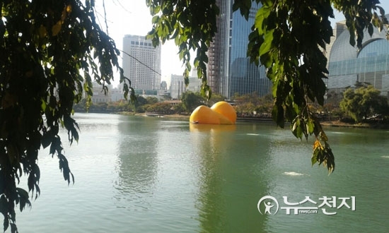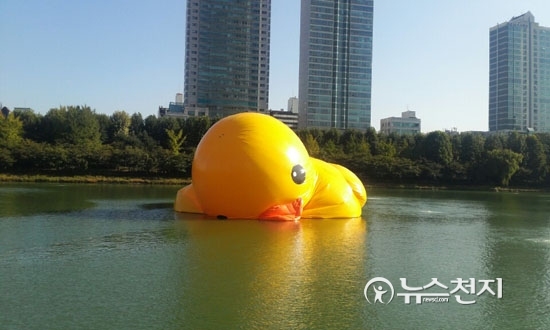 [천지일보=최유라 기자] 거대 고무오리 ‘러버덕’이 전시 시작 하루 만에 일부가 물에 빠져 아쉬움을 남겼다.