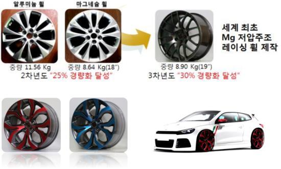 먼저는 중량 11.56㎏의 알루미늄 휠을 중량 8.64㎏(18인치)로 25% 경량화했다. 이어 중량 8.90㎏(19인치)의 30% 경량화한 마그네슘 저압주조 레이싱 휠을 제작했다. 이로써 ‘세계 최초’ 타이틀을 갖게 된 것이다. 경량화를 통해 얻는 장점은 연비 11~12% 향상, 환경유해가스 저감효과, 차량운동성능 향상, 타이어 마모 7~8% 개선 등이다.