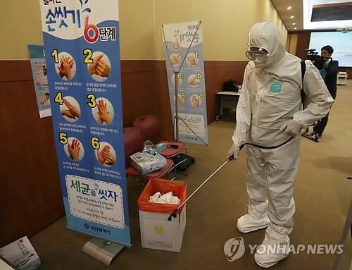 ▲ 국제전기통신연합(ITU) 전권회의 개막(20일)을 나흘 앞둔 16일 부산 해운대 벡스코(Bexco) 행사장에서 열린 에볼라 대응 모의훈련. 보호장구를 착용한 보건소 직원이 소독액으로 발열환자가 머문 장소를 소독하고 있다. (사진출처: 연합뉴스)