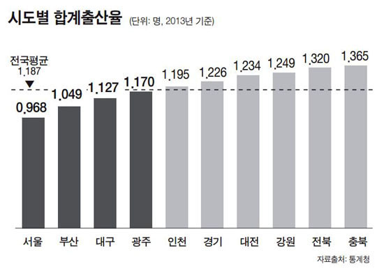 지역별로 보면 서울시 합계출산율은 0.968명으로 전국 17개 시·도 중 최하위를 차지했다. 이어 대구(1.127명), 광주(1.170명), 인천(1.195명) 등의 순이었다.