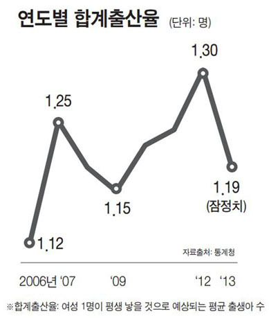 합계출산율은 1.19명으로 0.11명 감소했다. 여자 1명이 평생 낳을 것으로 예상되는 출생아 수인 합계출산율은 2005년 1.08명으로 최하위를 차지했다. 이어 2006년(1.12명), 2007년(1.25명)에는 증가했지만 2008년 이후 다시 하락세를 보이고 있다.