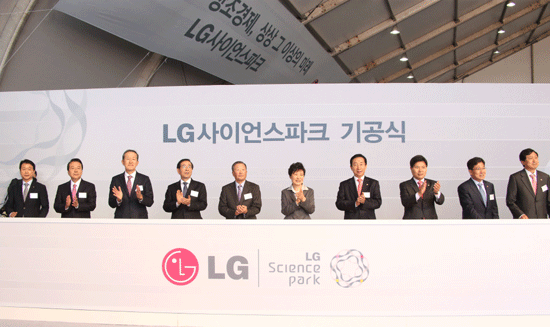 LG는 23일 박근혜 대통령을 비롯해 박원순 서울시장, 윤상직 산업통상부장관, 구본무 LG 회장 등 정·재계 인사 500여 명이 참석한 가운데 ‘LG사이언스파크’ 기공식을 열고 첫 삽을 떴다.