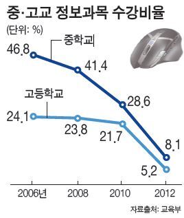 고교 정보과목 수강비율은 2006년 24.1%, 2008년 23.8%, 2010년 21.7%, 2012년 5.2%로 점점 하락했으며, 중학교 수강비율보다도 저조했다.