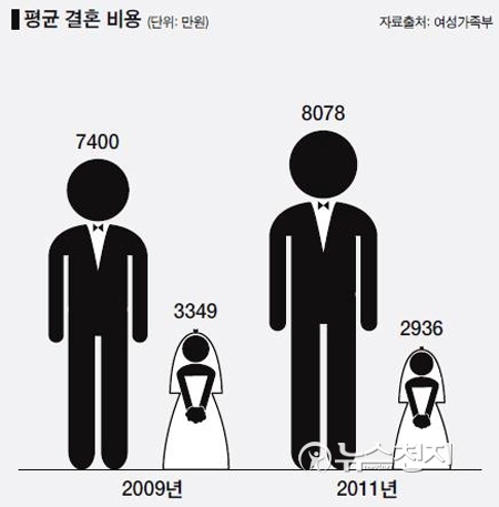 실제로 미혼남녀들이 결혼을 미루는 이유는 ‘결혼비용’이 1위로 나타났다. 여성가족부에 따르면 2011년 기준으로 남자의 결혼비용은 평균 8078만 원, 여자는 2936만 원을 쓰는 것으로 나타났다.