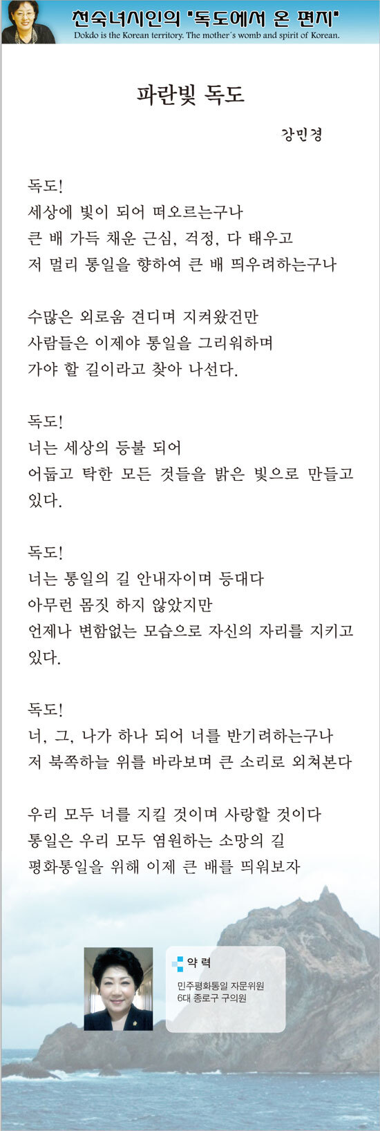 관련기사 [독도시] 부끄럽지 않느냐 - 전서영 [독도시] 독도 슈퍼마켓 - 이숙영 [독도시] 독도 - 무애자 청학 [독도시] 독도는 본토 지킴이 - 김일영 [독도시] 독도는 역사다 - 김종길 日정부 ‘한국 독도시설 중단’ 외교 성과로 자평 [독도시] 섬장대 - 고봉선 [독도시] 독도 처음 마주 하던 날 - 정영화 [독도시] 제 60주년 독도대첩 기념식 및 독도의용수비대원 합동 봉안을 추모하며 - 천숙녀 [독도시] 독도 - 탐욕 - 이규양 [독도시] 독도는 초계정 - 위맹량 [독도시] 개흙으로 보지 마라 - 이옥천