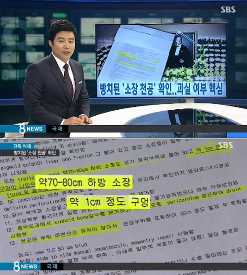 지난 1일 SBS는 지난 22일 고 신해철을 응급 수술한 현대 아산병원 수술 기록을 단독 입수, 신해철 소장 아래 70~80㎝ 지점에 1㎝크기의 천공이 발견됐다고 보도했다.