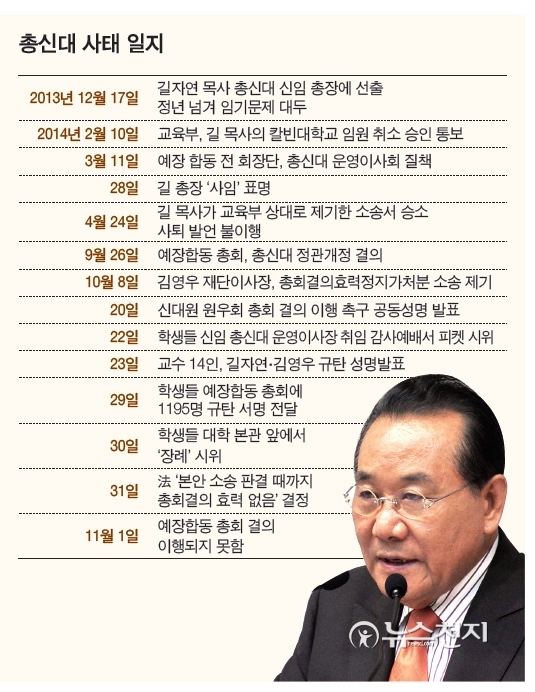 [천지일보=강수경 기자] 총신대학교 내홍이 장기전에 돌입했다. 김영우 재단이사장과 길자연 총장의 임기를 둘러싸고 재단이사회와 소속교단, 교수‧학생 간 마찰이 극심하다. 교단총회에서 결의한 교단법의 발효 시점이 지나가 일단락되는 듯했으나 법원이 김 이사장의 총회결의에 대한 효력 정지 가처분 소송을 받아들여 논란은 장기화할 것으로 전망된다.