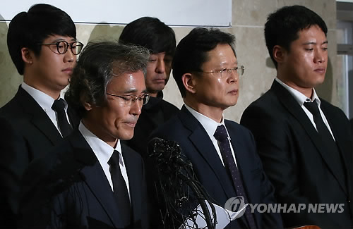 5일 오후 경기 안성 유토피아 추모관에서 故 신해철의 사망 사인을 둘러싸고 신해철 소속사 김재형 이사, 유족 대표인 매형 김형열 씨, 서상수 변호사가 기자회견을 열고 입장을 밝혔다.
