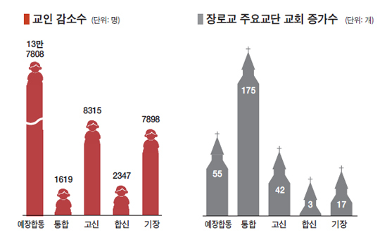 그러나 문제는 교회를 운영하는데 절대적인 영향을 끼치는 교인수가 대폭 줄었다는 것이다. 눈에 띄게 큰 폭으로 교인수가 감소한 곳은 예장합동으로 지난해보다 13만 7808명이 줄었고, 예장통합은 1619명이 감소했다. 고신도 8315명, 기장 7898명, 합신 2347명 등이 줄었다. 교세가 증가된 것으로 발표된 교단이 없다.
