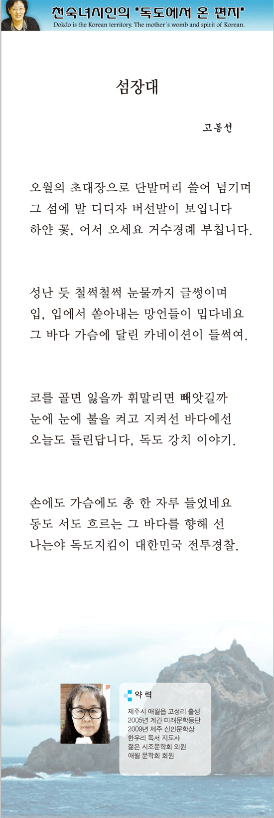 관련기사 [독도시] 파란빛 독도 - 강민경 [독도시] 부끄럽지 않느냐 - 전서영 [독도시] 독도 슈퍼마켓 - 이숙영 [독도시] 독도 - 무애자 청학 [독도시] 독도는 본토 지킴이 - 김일영 [독도시] 독도 처음 마주 하던 날 - 정영화 [독도시] 제 60주년 독도대첩 기념식 및 독도의용수비대원 합동 봉안을 추모하며 - 천숙녀 [독도시] 독도 - 탐욕 - 이규양 [독도시] 독도는 초계정 - 위맹량 [독도시] 개흙으로 보지 마라 - 이옥천