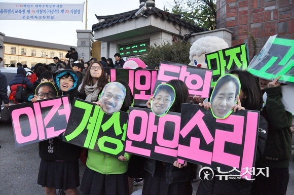 교사들은 몰려오는 수험생 가운데 제자가 보이면 적극적으로 손을 뻗어 포옹하는 등 용기를 북돋아 주기 위해 노력했다. 서울 성심여고 권기하 교사는 “요즘에는 자신의 꿈을 이룰 수 있는 길이 많다”며 “그래서인지 수험생들도 응원을 부담으로 느끼지 않고 즐기는 분위기”라고 말했다.