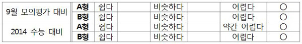 A형과 B형 모두 지나치게 쉬웠던 9월 모의평가에 비해서는 어렵고 작년 2014수능(추정평균: A형 67.7점, B형 69.9점)과 비교하면 A형은 약간 어렵고 B형은 어려운 수준이다. 그리고 올해 9월 모의평가와 달리, 상대적으로 약간 까다로운 문제들도 적정 수준으로 안배돼 1등급 구분 점수가 A형은 96전, B형은 95점 내외에서 형성될 것으로 예상된다.