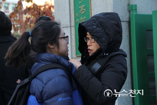 [천지일보=김민아 기자] 2015학년도 대학수학능력시험일인 13일 오후 시험을 마치고 나온 자녀가 고사장인 서울 중구 순화동 이화여자외고에서 나오자 엄마가 옷매무새를 다듬어주며 격려하고 있다.