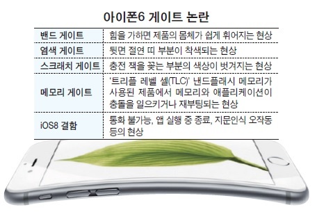 얼마 안 돼 이번에는 아이폰6 플러스 뒷면에 인쇄된 ‘iPhone’과 ‘Designed by Apple in California Assembled in China’ 문장이 기울여져 인쇄됐다는 ‘로고게이트’가 추가됐고 가장 최근에는 메모리 결함과 충전 잭 주변의 색상이 벗겨지는 결함, iOS8 결함도 드러났다.