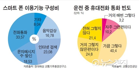 스마트폰 사용 용도는 인터넷 검색·문자메시지가 41.6%로 가장 많았다. 통화(33.6%), 음악 감상(16.7%) 등이 뒤를 이었다. 전체 사용자의 21.7%는 사고를 당할 뻔한 경험이 있는 것으로 나타났다. 연령별로는 20대(38.3%)가 가장 많았다.