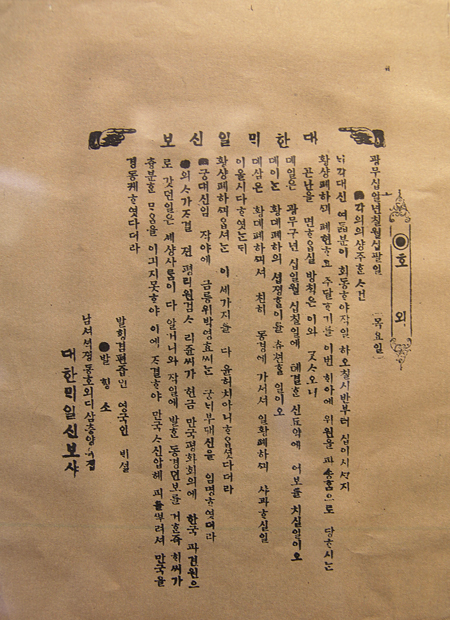대한매일신보는 러일전쟁이 일어난 1904년부터 한일합방이 되던 1910년까지 격동의 세월 가운데 대표적 항일 언론으로, 일제의 침략행위를 비판하는 논설과 기사를 연일 보도하고 국민의 애국정신을 고취시켰다는 점에서 역사적 의의가 크다.