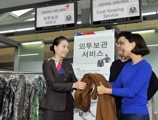 아시아나의 ‘외투보관 서비스’는 겨울철 따뜻한 곳으로 여행을 떠나는 여행객들의 불편을 덜어주기 위해 일정 기간 외투를 무상으로 보관해주는 서비스이다.