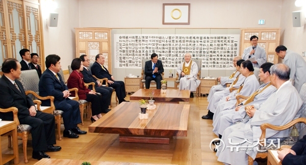 [천지일보=강수경 기자] 정의화 국회의장이 28일 전북 익산 원불교중앙총부에서 원불교 최고지도자인 경산종법사를 접견했다. 이날 경산종법사는 정 의장에게 ‘중산(中山)’이라는 호와 함께 달마도를 선물했다. 정 의장이 원불교 관계자들에게 합장 후 인사를 하고 있다.