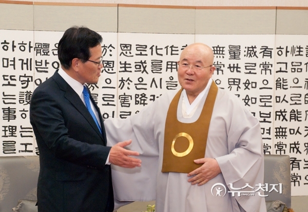 [천지일보=강수경 기자] 정의화 국회의장이 28일 전북 익산 원불교중앙총부에서 원불교 최고지도자인 경산종법사를 접견했다. 이날 경산종법사는 정 의장에게 ‘중산(中山)’이라는 호와 함께 달마도를 선물했다. 경산종법사와 정 의장이 인사를 나누고 있다.