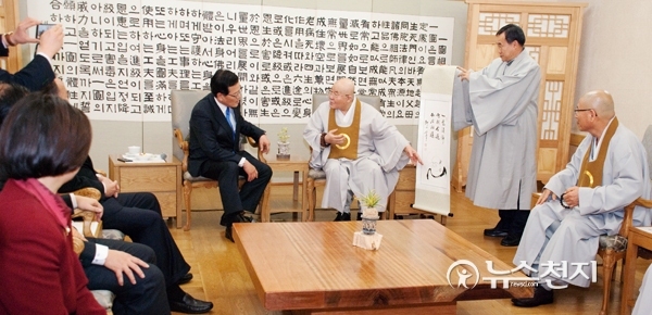 [천지일보=강수경 기자] 정의화 국회의장이 28일 전북 익산 원불교중앙총부에서 원불교 최고지도자인 경산종법사를 접견했다. 이날 경산종법사는 정 의장에게 ‘중산(中山)’이라는 호와 함께 달마도를 선물했다. 경산종법사가 달마도의 의미를 설명하고 있다.