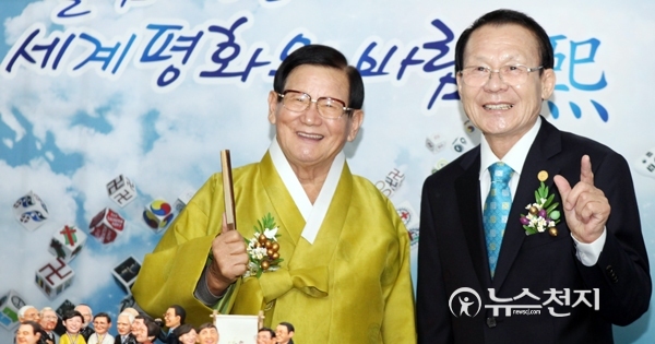▲ 신천지 이만희(왼쪽) 총회장과 지재섭 베드로지파장이 포토존에서 사진을 촬영하며 행복한 미소를 짓고 있다. ⓒ천지일보(뉴스천지)