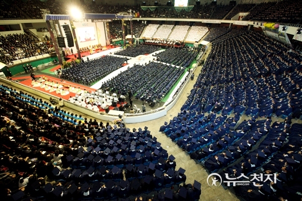[천지일보=이지수 기자] 국내를 넘어 세계로 뻗어나가는 신천지가 이번에는 ‘빛고을’ 광주에서 또 한 번의 대규모 시온기독교선교센터 수료식을 열어 관심을 끌었다. 신천지예수교 증거장막성전(신천지, 총회장 이만희) 베드로지파는 ‘하늘씨앗으로 온누리家 평화민국’이란 슬로건을 내걸고 30일 광주 서구 화정동 염주종합체육관에서 ‘시온기독교선교센터 제99기 2반 수료식’을 열고 4295명의 수료생을 배출했다.