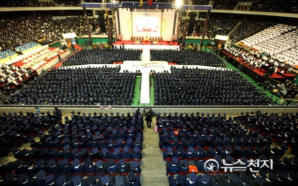 [천지일보=이지수 기자] 국내를 넘어 세계로 뻗어나가는 신천지가 이번에는 ‘빛고을’ 광주에서 또 한 번의 대규모 시온기독교선교센터 수료식을 열어 관심을 끌었다. 신천지예수교 증거장막성전(신천지, 총회장 이만희) 베드로지파는 ‘하늘씨앗으로 온누리家 평화민국’이란 슬로건을 내걸고 30일 광주 서구 화정동 염주종합체육관에서 ‘시온기독교선교센터 제99기 2반 수료식’을 열고 4295명의 수료생을 배출했다.
