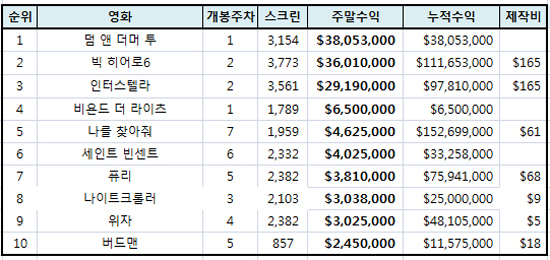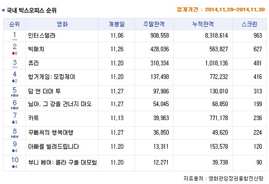 지난 2일 영화진흥위원회 영화관입장권통합전산망에 따르면 일별 박스오피스(전날 집계) 순위에서 ‘인터스텔라’는 1위로 39.4%라는 압도적인 점유율을 유지했다. 2위인 한국영화 ‘빅매치(22.4%)’보다 2배다. 또 이 영화의 누적 관객수는 841만 4000명이고 누적매출액은 672억 9000만 원에 이른다.